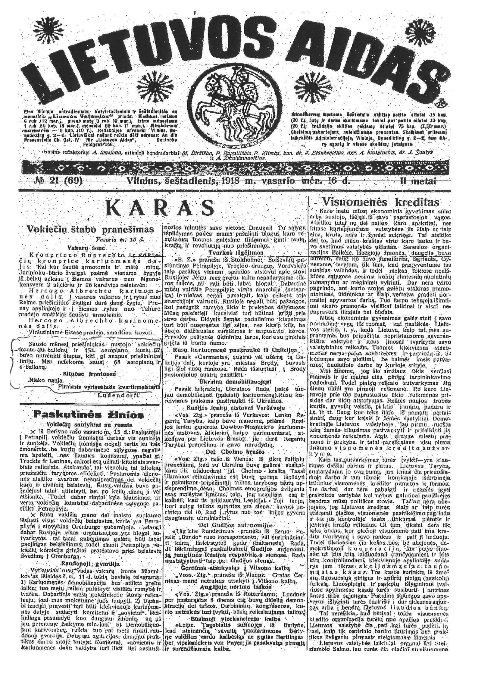 Post scriptum. Istorija turi savo logiką. Gal tiktai reikia nuolat kruopščiai dirbti vardan tos Lietuvos. Profesorius Liudas Mažylis praeitų metų pavasarį Vokietijos archyvuose aptiko Vasario 16-osios Aktą įrodydamas, kad nuosekliu ir kruopščiu darbu bei asmeniniu užsidegimu galima nuveikti daugiau nei ištisos tyrėjų grupės institutuose, archyvuose ar ministerijų departamentuose. Dirbti Lietuvai. Informacija apie Vasario 16-osios Aktą buvo išspausdinta „Lietuvos aido“ 1918 m. vasario 19 d. numeryje, bet aš nusprendžiau peržvelgti 1918 m. vasario 16 d. numerį. Jame aprašomos Vokietijos derybos su bolševikais dėl taikos ir karo belaisvių, pateikta trumpa Rytų fronto štabo viršininko Ericho Ludendorffo pasirašyta informacija apie įvykius Vakarų fronte, paminint, kad „kituose frontuose nieko nauja“. Skyrelyje „Žinios iš Lietuvos“ paskelbta: „Med. d-ras Pranas Mažilis, sugrįžęs iš Krokuvos į tėviškę ir apsilankęs Vilniuje, ketina susikurti Panevėžyje ir ten gydytojauti.“ Pranas Mažylis, 1913 m. baigęs Krokuvos universitetą, akušerijos klinikų Kaune kūrėjas, vienas garsiausių tarpukario Lietuvos medikų, yra profesoriaus Liudo Mažylio senelis.
