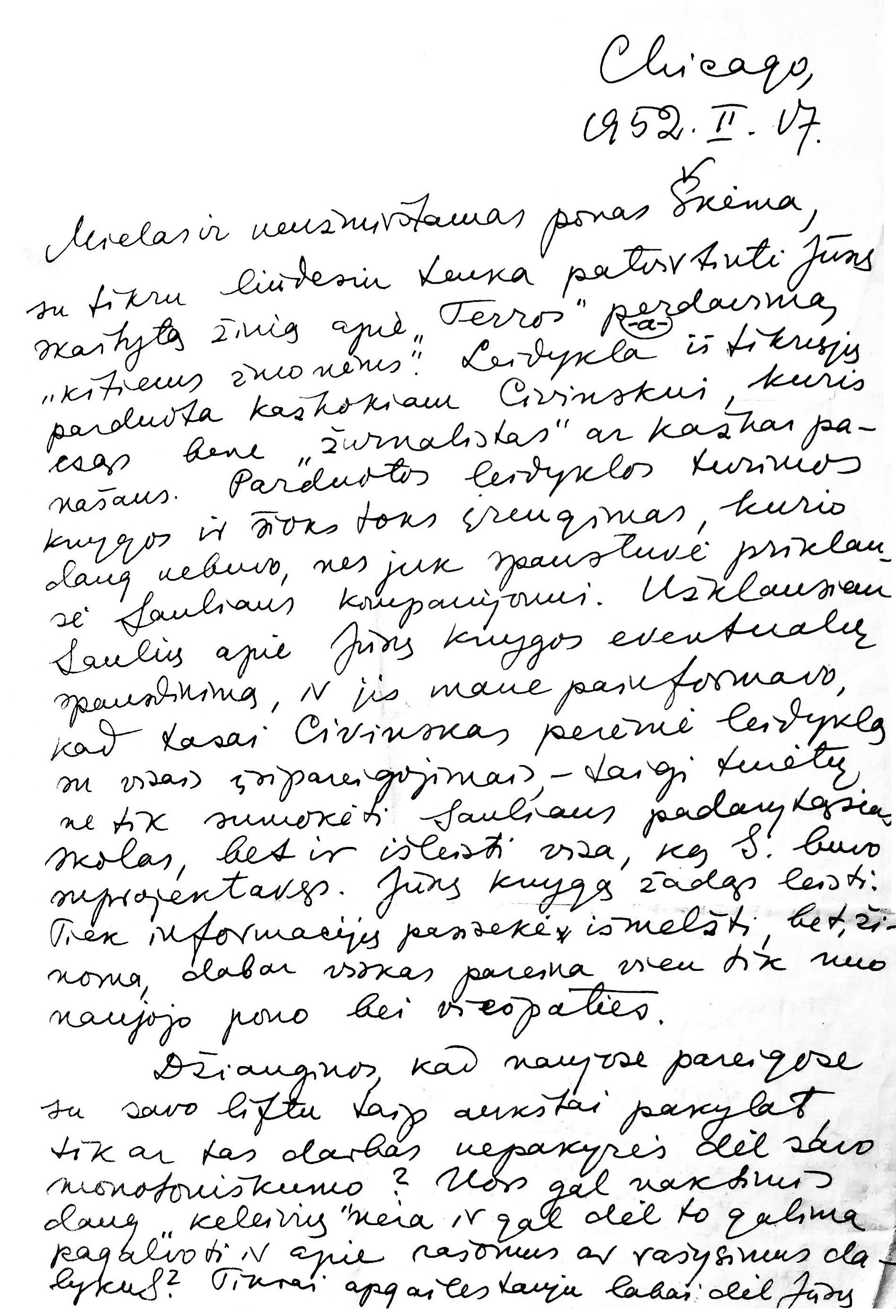 1952 m. vasario 17 d. Henrikas Radauskas atsakė į rašytojo Antano Škėmos laišką. Tekste atsiskleidžia to meto lietuvių išeivijos leidybos situacija – bankrutuojančios spaustuvės, leidyklų permainos, nerimas dėl kūrinių publikavimo, taip pat asmeninės abejonės ir viltys.
