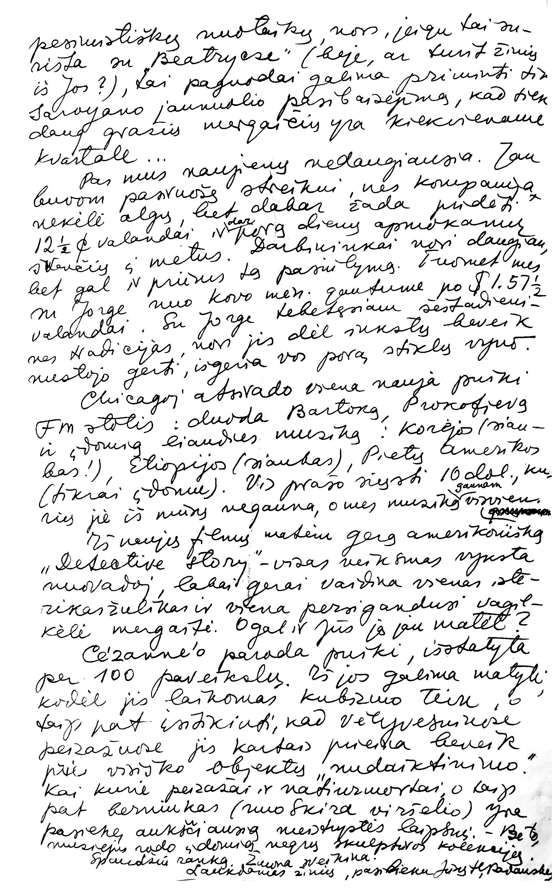 Džiaugiuos, kad naujose pareigose su savo liftu taip aukštai pakylat, tik ar tas darbas nepakyrės dėl savo monotoniškumo? Nors gal naktimis daug „keleivių“ nėra ir gal dėl to galima pagalvoti ir apie rašomus ar rašysimus dalykus? Tikrai apgailestauju labai dėl Jūsų pesimistiškų nuotaikų, nors, jeigu tai surišta su „Beatrycze“ (beje, ar turit žinių iš Jos?), tai paguodai galima priminti tik Saroyano jaunuolio pasibaisėjimą, kad tiek daug gražių mergaičių yra kiekviename kvartale…
